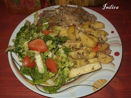 Месо с картофи на фурна и салатка от китайско зеле с доматки
