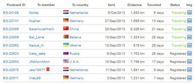 Участниците изпратиха картички до различни държави, включително Швеция, Финландия, Белгия, САЩ, Беларус, Китай, Русия и Германия. Освен това те изпратиха картички до Чехия и Чикаго. Въпреки че доставката може да отнеме различно време в зависимост от местоположението на получателя , участниците с нетърпение очакват получаване на картичките и споделят своите преживявания. Изпратени са картички до различни страни като Холандия, Германия, Русия, Беларус, Украйна, Китай, Тайван, САЩ , Финландия , Полша и др. Поздравителни картички бяха получени от различни страни като Холандiя , Германия , Русия , Беларус , Съединените щати , Япония , Китай , Краснодарск и Санкт Петербург.