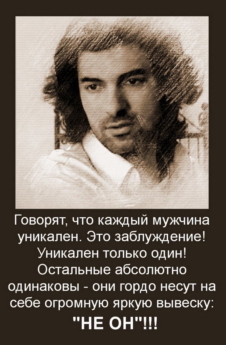 "Казват, че всеки мъж е уникален. Това е заблуда! Уникален е само един! Останалите са абсалютно еднакви - те всички гордо носят огромен ярък надпис "Не съм ТОЙ"!!!"