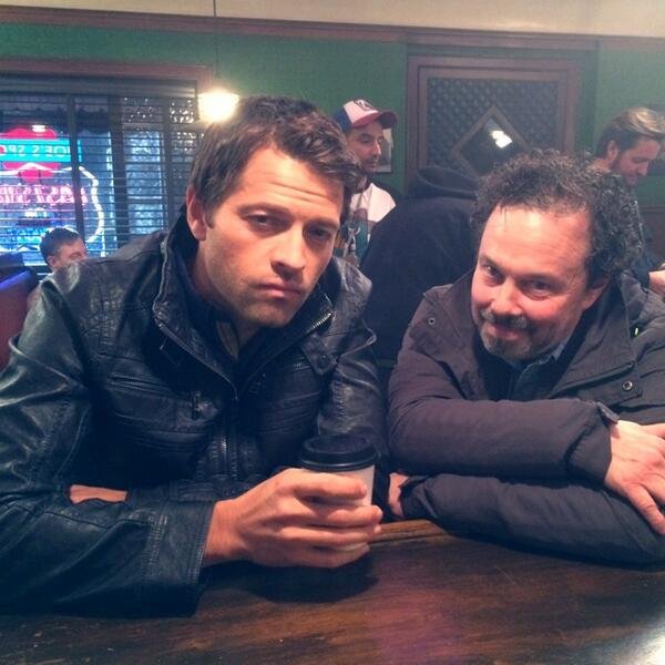 Снимката е от сета на 9.10 "Road Trip". Oтзад вдясно е един от операторите, така че е вероятно да са с дрехите за сцената, епизода. Якето и ризата на Метатрон са същите като в 8.23 "Sacrifice". Според мен на Мишата/Кас му е добре така. То на кого ли не отива кожа, сепак Laughing .