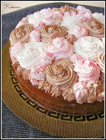 Измазана с шоколадов ганаш и украсена с рози от сметана ( едните са с ванилия, другите с шоколадова сметана, а третите само с боя Mr. Green)