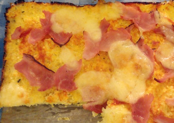Карфиола се накъсва на розички и се слага за 5 мин. във вряща вода. Отцежда се и се охлажда. Пасира се в чопър, да стане на трохи, а не на каша. Разбърква се в купа с яйцата, изварата и настърган половината от кашкавала.   Разстила се в тавичка 22 на 28 см. и се пече около 30-40 мин. на 180 градуса. Изважда се намазва се кетчупа, слага се рехаво шунката и другата половина от кашкавала и се пече още около 10 мин.