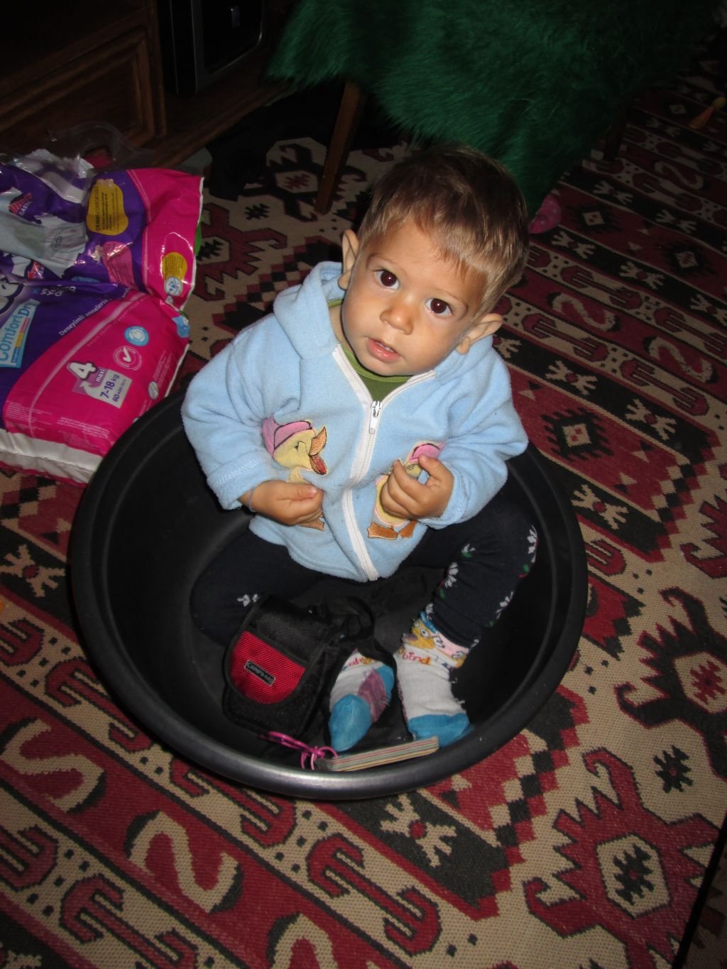 Никола си играе с капачки от буркани, кестени, чували за боклук, ютията и пералнята, както и с кухнята на кака си, друго не признава, и понеже ще е заточен при бабите мисля да му закупя за там една кола каквото иска да я прави. Проходилките не ги поглежда с изкл на една дървена с шарени кубчета, лъва го носи и му натиска носа, за да пее.