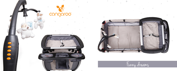 Funny Dreams има специален гриф с играчки, снабден с различни мелодии за приспиване, вибрация, светлини, въртене на играчките и малък бонус – активиране при бебешки плач. Този тип кошарки са идеални за използване както в домашни условия, така и когато сте на почивка – достатъчно е да я сгънете с няколко движения и да я поставите в специалната чантичка за транспорт и Funny Dreams e готова да ви придружи до всяка точка на света.