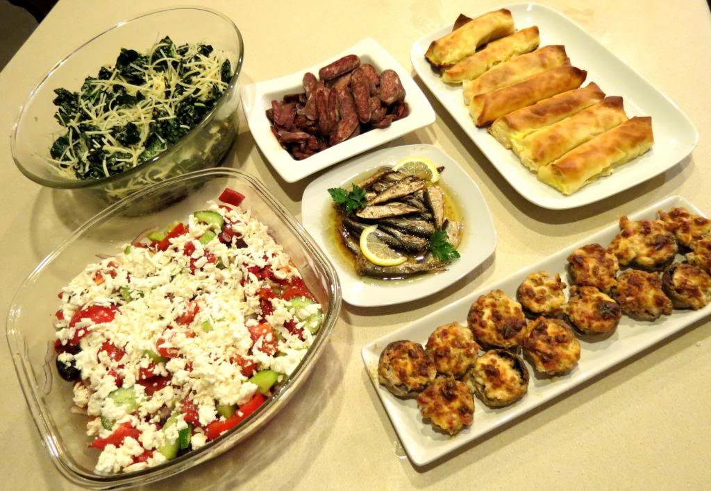 И разни мезета и салатки, домашен суджук и мини банички с кори за китайски рулца