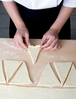Срязват се малко в средата на основата на триъгълника, за да стане по голям и се навива.