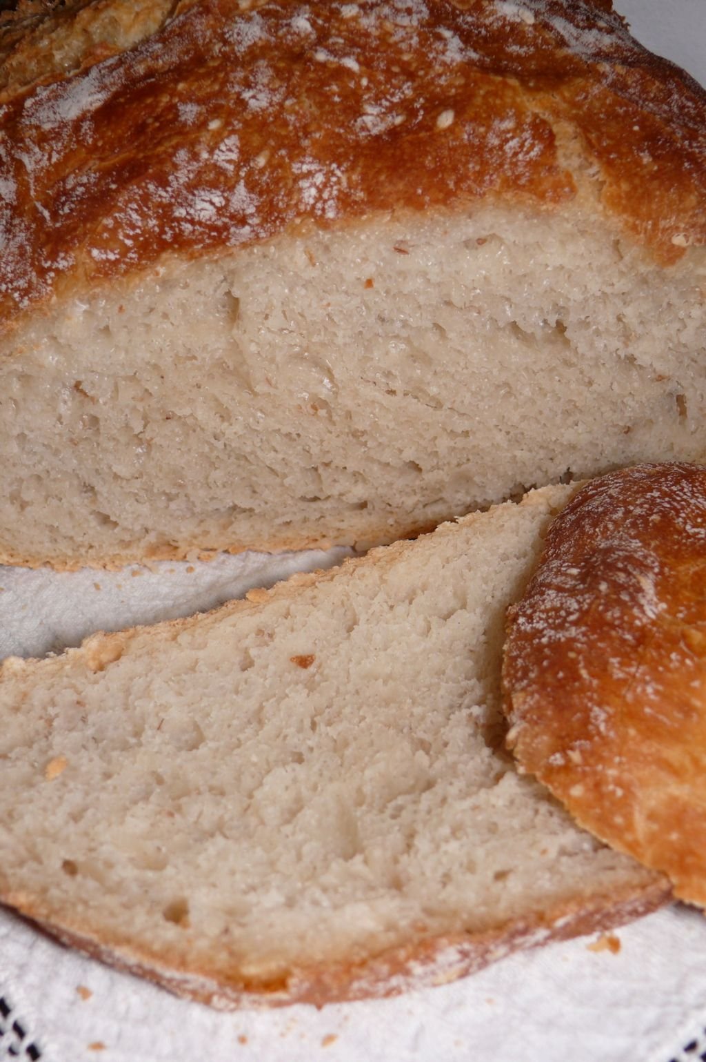 Та разтварям маята в малко вода (100тина мл.) разтварям маята. Сипвам я в кладенче в брашното, където съм добавила захарта и солта. наливам и водата и обърквам всичко до мокро тесто. Оставям го в затворен съд, да втасва през нощта и на сутринта на силно набрашнена повърхност изсипвам тестото, работя с набрашнени ръце и го сгъвам няколко пъти като бизнес писмо, показано е в рецептата а кроасаните. Оформям на топка (в кръгла тенджера пека, та затова) и втасва на набрашнена пекарска хартия в ракопчаваща се тортена форма  при мен. По някое време преди да е готово тестото, включвам фурната на 230С и я загрявам с тенджерата, в която ще пека. С хартията пренасям тестото и пека под капак/ алуминиево фолио 30мин. и открито - 15-20мин.