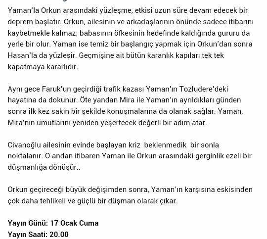 Срещата между Яман и Оркун лице в лице,ще предизвика земетресение,влиянието на което ще се усеща дълго време.Оркун няма да остане само с това да загуби уважението на приятелите и семейството си. Когато стане мишена на  гнева на баща си,гордостта му също ще се срине на земята.