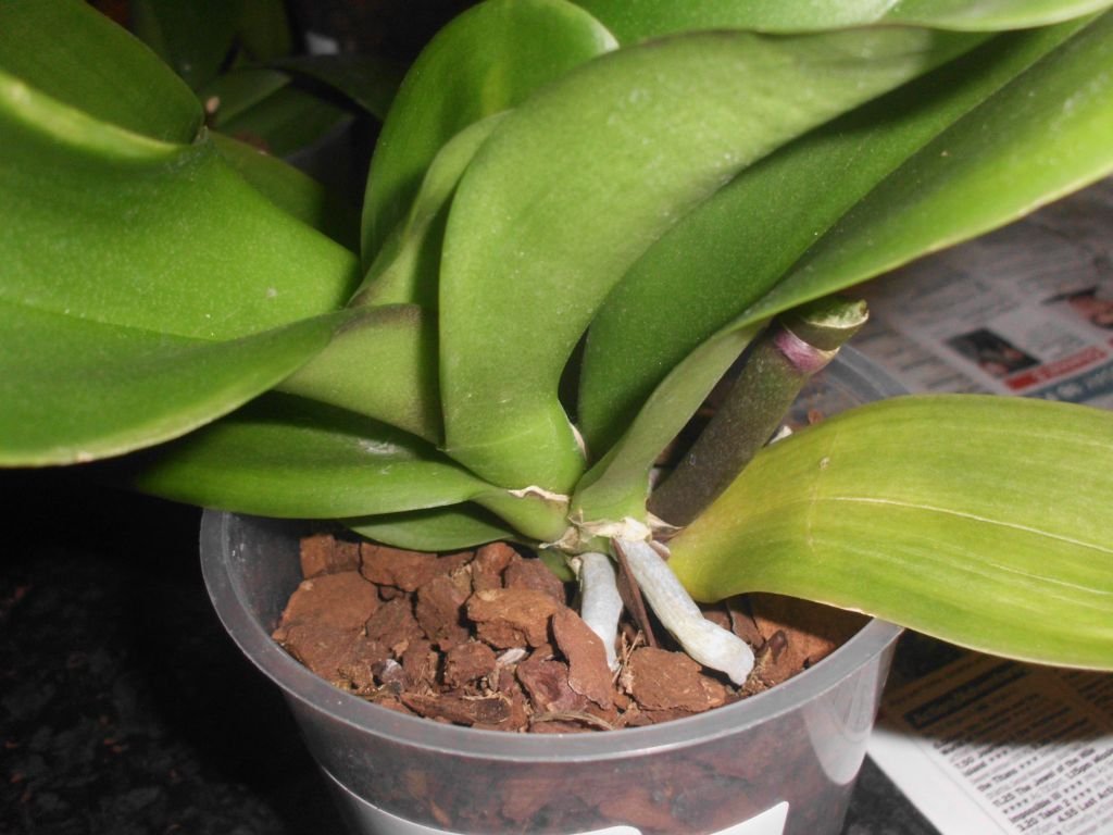 В средата точно листа почерня и падна. Получи се като кладенче. Там щъкаха онези сребричти гадинки. Кладенчето беше обградено отстрани с два листа. С една клечка за уши натопена в спирт изтърках хубаво кладенчето. И на следващия ден също. то се вдърви направо. след месец окапа едното листо но едно остана. Заедно с вдървеното кладенче. Сложих фалчето в един забутан ъгъл. и запончах да го поливам през поливане на цветята. значи е било на 2 -3 месеца месеца. Беше на сянка  Така че изкарала от 8-ми март до декември. На поредното поливане края на декември видях че е пуснала кейки в основата ( нямаше как да е на цветоноса защото той изсухна). Това кейки сега стна на две години. Доста голямко е на три листа но не може да се раздели- расте от корен на майката. Не е и цъфтяло досега но карай. Все някога ще стане. Листата му са по 10 сантимерта. смятам че есента ще даде цветонос и ще ме възнагради за търпението.