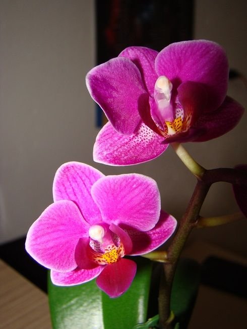 И аз съм любителка на орхидеите. Голяма работа са - красиви са и цъфтят дълго време... Направо разкош. Вкъщи имам два фаленопсиса и една милтония. Едната от вида фаленопсис я имам от три години. Веднъж я разсадих в малко по-голяма саксия. Цъфти ми по 5-6 месеца, а после почива 1-2. Тя е лилава с три цветоноса, на която в момента само на новопорасналия от преди два месеца цветонос има 4 цъфнали цвята и една пъпка, а другата е бяла с лилаво в средата с един цветонос с десетина цвята. Цъфти откакто го купих в началото на декември. Милтонията ми е от есента и откакто прецъфтя и й отразах изсъхналите цветоноси не се случва кой знае какво. Чудя се дали да не я разсадя. Има мисля че три корена в една саксия и малко ми изглежда посърнала.