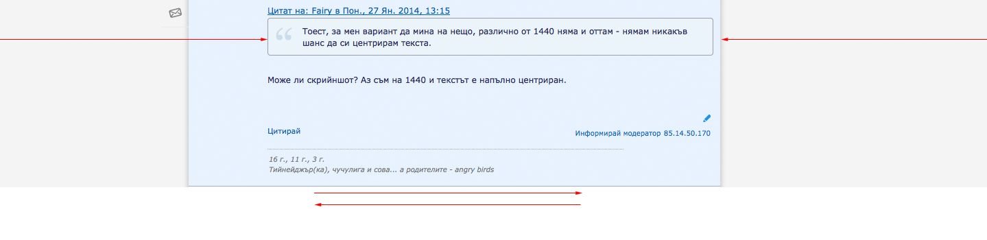 Ами мен лично продължава страшно да ме дразни изместването в ляво. Не е вариант да мина на по-ниска резолюция, защото тогава като цяло всичко ми става лошо четимо, не само форума, но и каквито и да били други документи на компютъра. Тоест, за мен вариант да мина на нещо, различно от 1440 няма и оттам - нямам никакъв шанс да си центрирам текста.