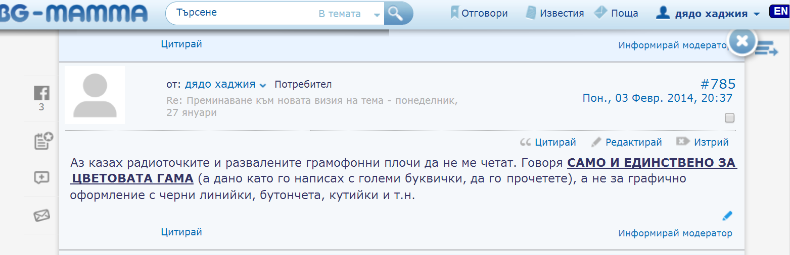 Аз пък предлагам още по радикално предложение. Снимката на профила да бъде намалена и да я качат най-горе в ляво. Така ще се освободи по-широко поле за текста на поста. В края на краищата тук идваме да споделяме своите мнения и да четем такива на другите, а не на изложба  на картинки и тем подобни неща. Който пък иска да се радва на аватара, нека му се даде възможност като кликне върху него да си го гледа в по-голям формат. Така е и в социалните мрежи. Ето нещо такова го виждам: