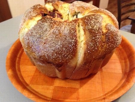 Оставя се за още 40-45 минути да втаса. Маже се с разбит жълтък с олио, поръсва се със захар и се пече в умерена фурна до готовност.
