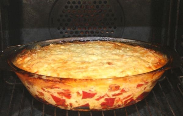 След като се разбърка тестото, половината се сипва в намазнена тавичка и се слага във фурната на 180 градуса с горен и долен реотан.