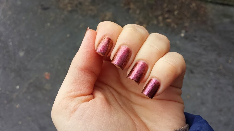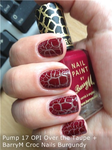 Това е топ лак на Бари М, казва се Barry M nail paint croc effect Burgundy. Сложен е върху Barry M nail paint Raspberry. Направо ви показвам снимките от един непуснат блог пост, после гугъл ще ми се сърди като ги кача, ама вие сте ми по-важни Simple Smile
