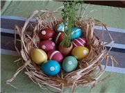 П@нди ползвам най обикновени бои от тия в капсулите , 7капсули са в опаковка на "Дидра - 97", но за да станат ярки, светли цветовете боядисвам и бели яйца. Държа ги за кратко в боята, колкото по дълго стоят, толкова по наситен цвят стават. С обикновените, червени яйца и на мен не ми се получават толкова светли и красиви цветове. Тези са от миналата година, не знам дали боите бяха на същата фирма, но пак са боядисани с капсули.