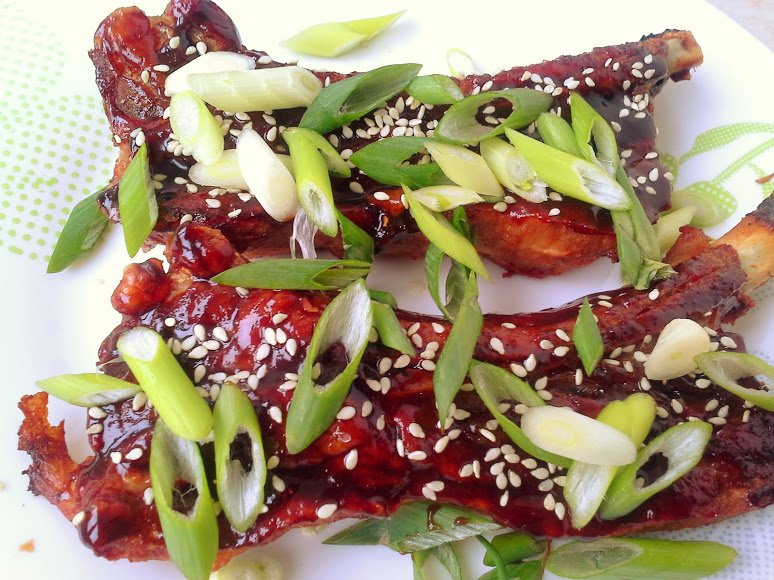 ivves, нарязани ги редя в тавичка, сол,черен пипер ,вода, мъничко олио и пека докато се изпекат добре и останат на мазнина. Отделно в тиган смесвам за соса различно всеки път, но винаги има лъжица балсамов оцет, лъжица соев сос, лъжица горчица и сладко от праскови две супени лъжици.Днес сложих и кетчуп и настърган джинджифил, друг път слагам лъжица-две Кока-кола или мед с лимонов сок и джинджифил.Всичко ври, докато се сгъсти, като се бърка непрекъснато. Соса може да се прави по собствен вкус.Накрая мажа ребърцата със соса и допичам за 5 минути.Ръся със сусам и пресен лук.