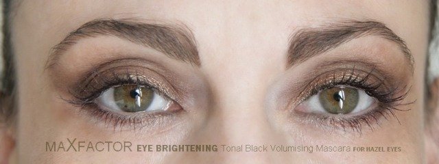 има същите технически свойства, но не ме грабва толкова, вероятно, защото се харесвам повече със зелени, а не с лешникови (каквито стават при по-малко светлина) очи. Тушът й бих оприличила като тъмно злато, преминаващ по миглите в черен. Мисля, че е някак по-сух и под определен ъгъл на дневна светлина я отразява в тъмнозлатисто (леко се забелязва това върху миглите на дясното око т.е. на снимката - вляво).