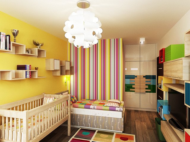 Аз лично бих сложила бели мебели или комбинация от бяло и цвета на паркета. Цветните акценти ще дойдат от завивки, възглавници и играчки  Peace