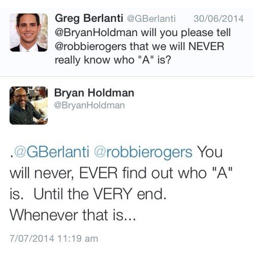 А и в туитър не си спомням кой от екипа беше запитан нещо относно А и отговора му беше "Никога, НИКОГА няма да разберете кой е А, до самия край...когато и да е той"