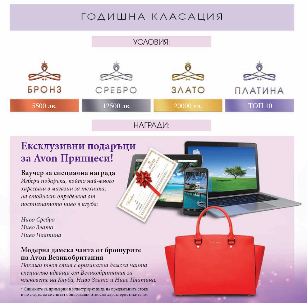За да получите подаръци от Avon, като чанти, колиета и други, трябва да постигнете определена сума в поръчките си. Сумата и условията за всяка кампания могат да варират. Например, за чанта и портмоне, трябва да имате поне 120 лева в една поръчка за всяка кампания. За получаване на третия подарък е необходимо общо 780 лева в трите кампании и трябва да сте били активни във всички тях.