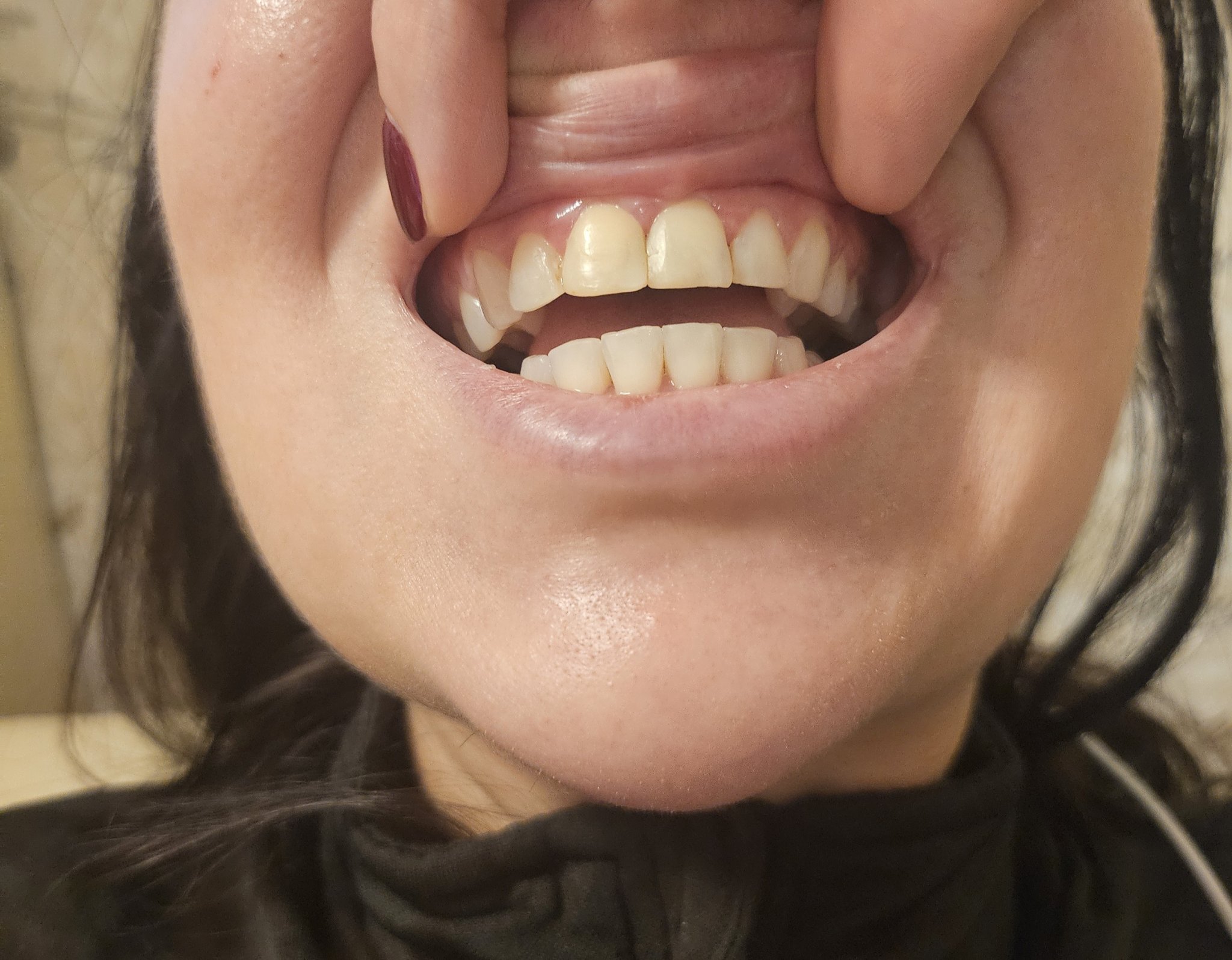 Прилагам снимки на зъбите си в момента. Видео на захапката и се опитах да снимам проблема отдолу. Моля за мнение как може да процедираме! Идеята ми е да се направят 6 зъба, при необходимост 8.