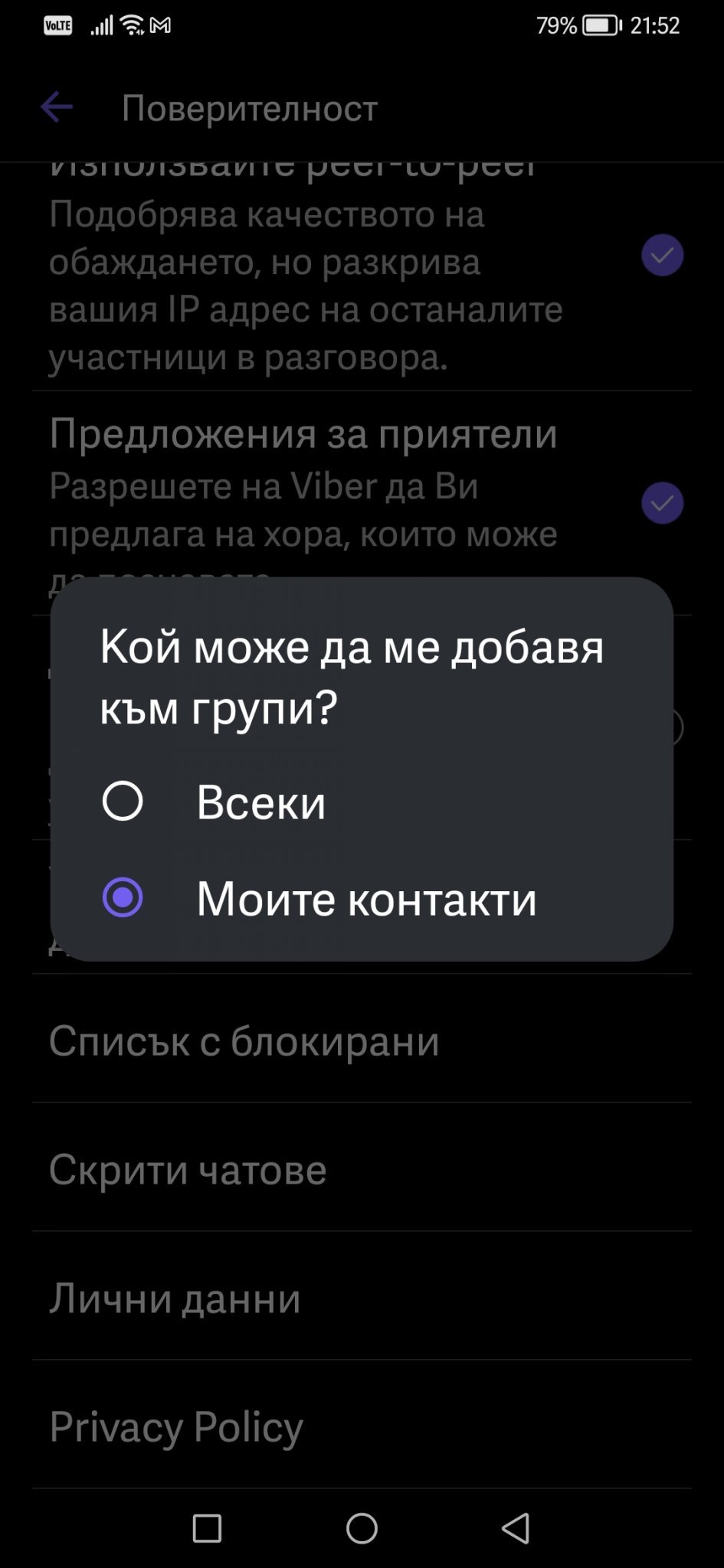 Мога ли да направя така, че никой от контактите в телефона ми да не може да ме добавя в групи?