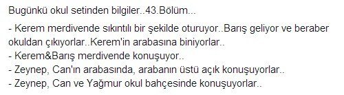 Керем стои на стълбите без настроение. Идва Баръш и заедно си тръгват от училище с колата на Керем. Преди това разговарят.