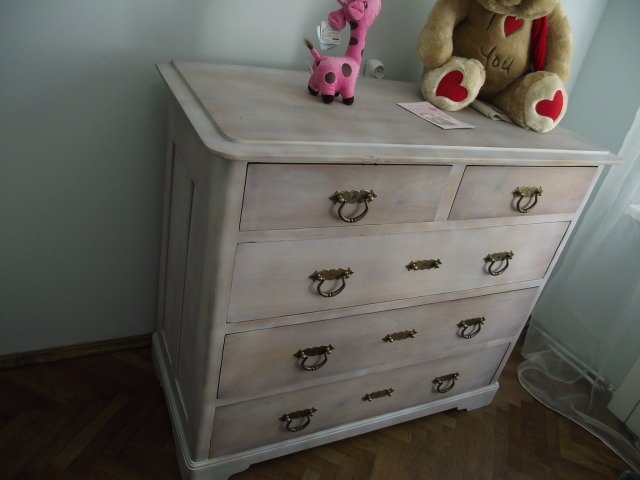 , но дори и след шкуренето не се получи. Беше покрит с някаква восъчна вакса. Затова решихме да го боядисаме съвсем леко с компресор с акрилна боя. Пак се вижда фладера на дървото, но не е като с маслото, а и не става равномерно, а стои на облачета.