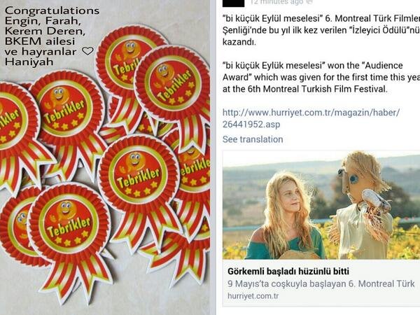 "Малък септемврийски проблем" спечели "Наградата на публиката",  която се дава за първи път на 6-я фестивал на Турското кино в Монреал."