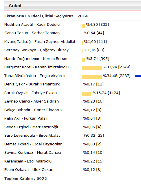 Приключила е още една анкета: "Идеалната екранна двойка за 2014 г. е Енгин Акюрек - Туба Бюйюкюстюн".