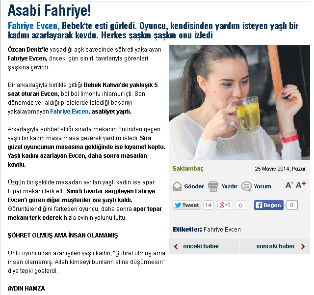 Тази статия за Фахрие, като че ли е ответната реакция на "журналята", че тя не им е дала интервю докато е била в това кафе