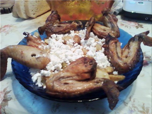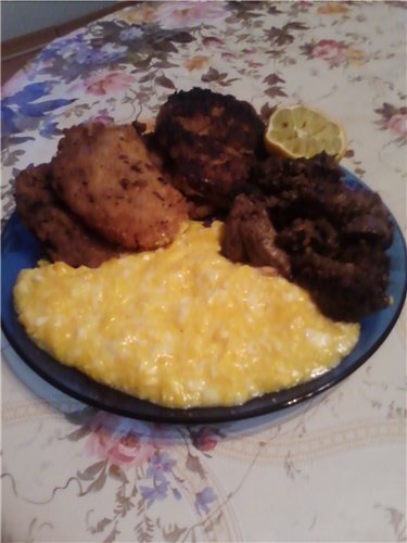 дробчета на фурна с гарнитурки- картофени кюфтета и бъркани домашни яйца