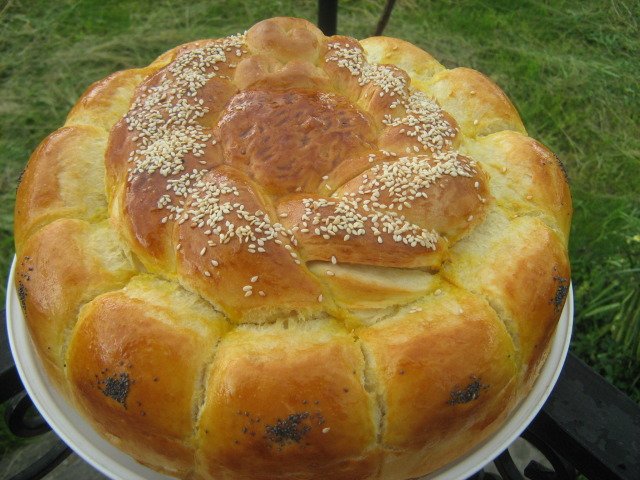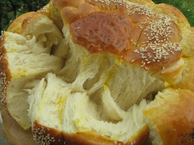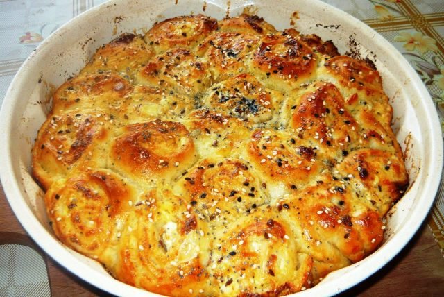 Тутманик с много масло, шарена сол и сирене.