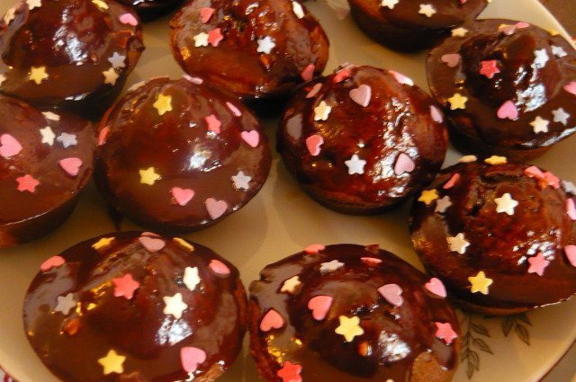 Мини кексчета с банан и ягоди и отново поляти със шоколад