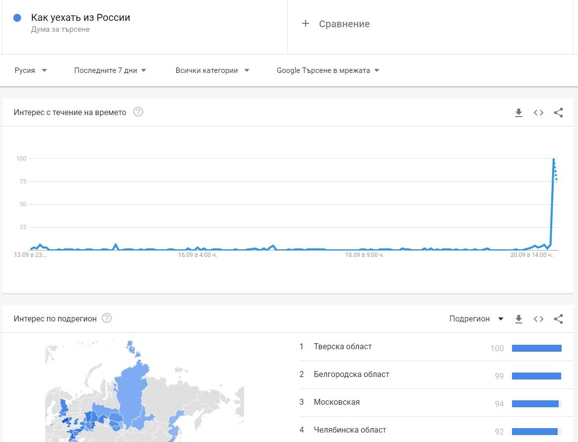 Освен по изкупените билети за бягство - може да се проследи и в динамиката на търсенето на фразата "Как да напусна Русия":