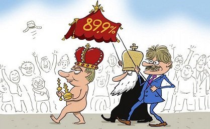 Тази карикатура също може да се промени малко, вместо патриарха да се сложи мюфтията и 99.7%, защото на изборите през 2012 хуйло печели точно с толкова в Чечня, на следващите избори пак е над 90%, но този път в рамките на 91-92%, явно е казал на Кадиров да разпредели останалите 8% на другите кандидати, с годините е станал по-щедър.