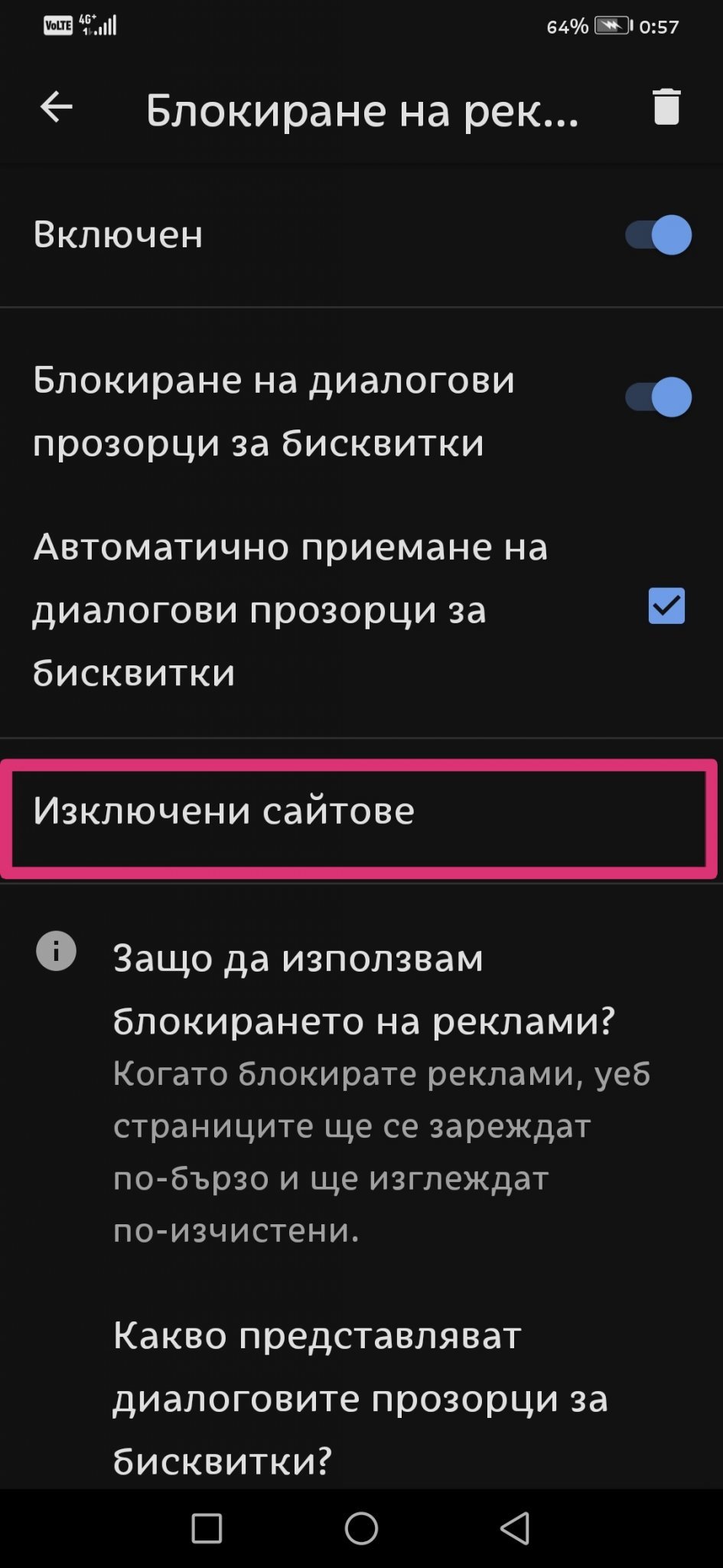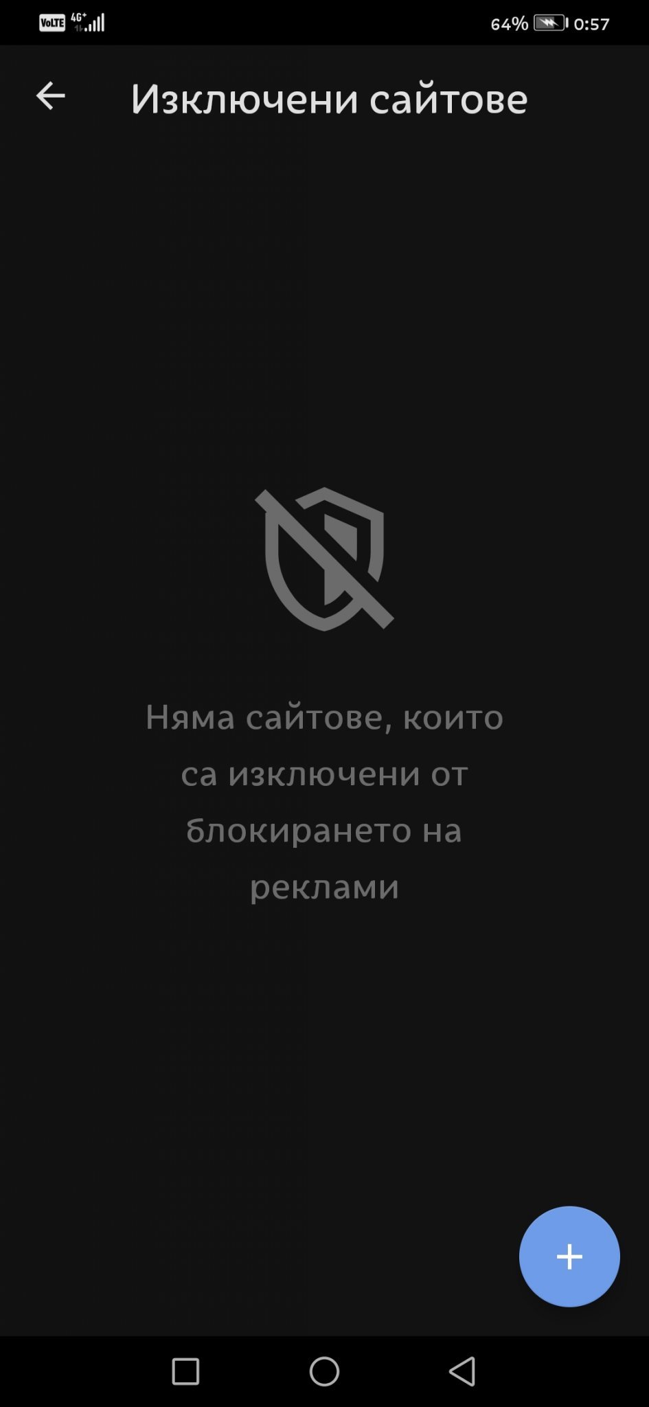 И ей тук в това поле, предназначено за списък с изключени от предпазване от реклами сайтове, се мъдреше bg-mamma! Изтрих го и всичко си дойде на място!