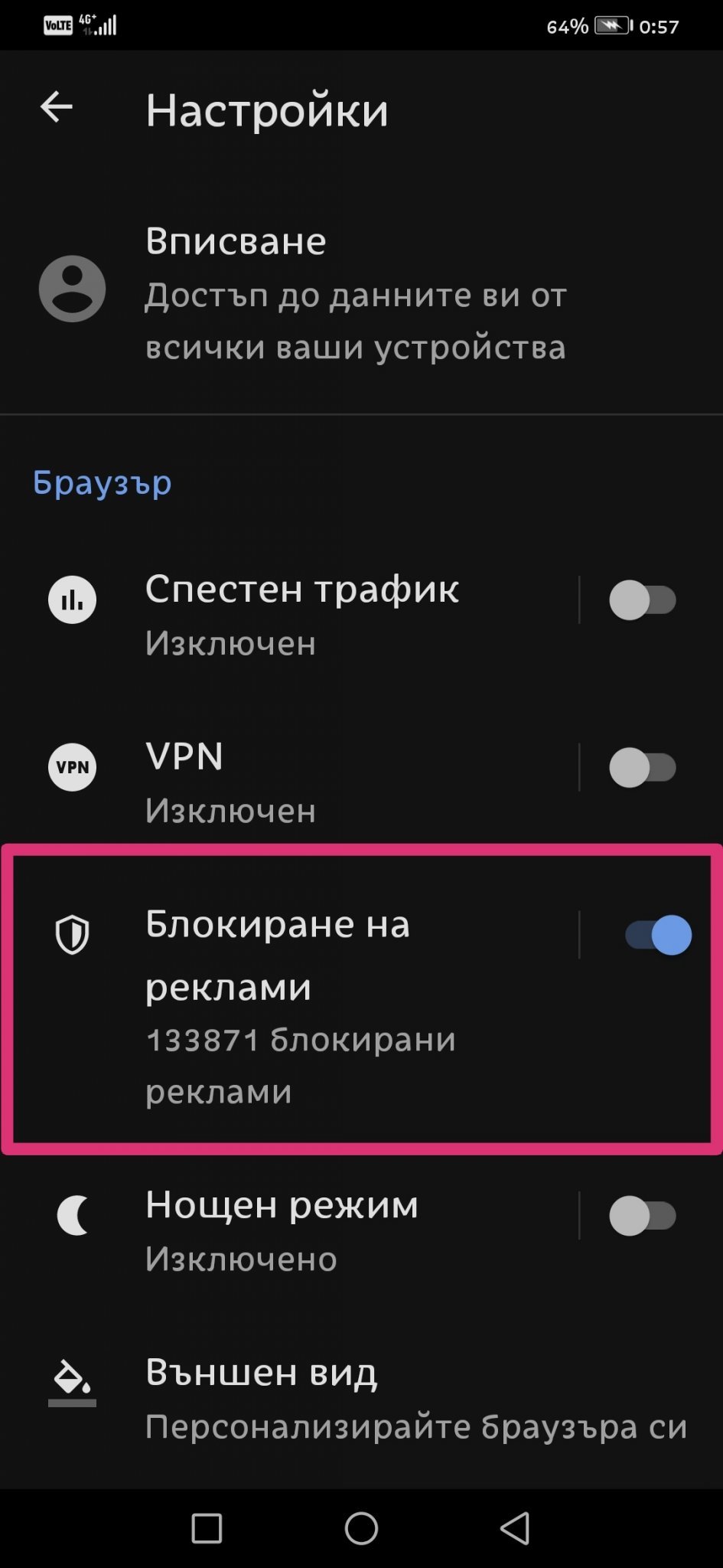 На лаптопа нямам проблем, за телефона е това. Opera e с вградена защита от реклами, включена е и от днес не ме защитава от реклами тук, във форума.