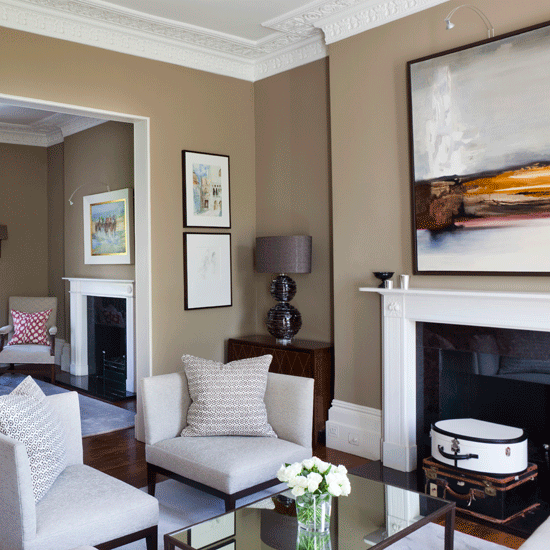 Много елегантен цвят, идеално откроява масла със златиста рамка, графики с паспарту, месинг, всякакви лампи и лампиони, но наистина идва тъмен за дневно ползване в ниски помещения, особено зимата.