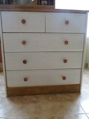 Здравейте. Преди време, четейки тук успях да боядисам едни пдч чекмеджета на скрин в синьо и се получи страхотно. Сега същите чекмеджета + останалата част от цялото спално обзавеждане са на път да станат бели.