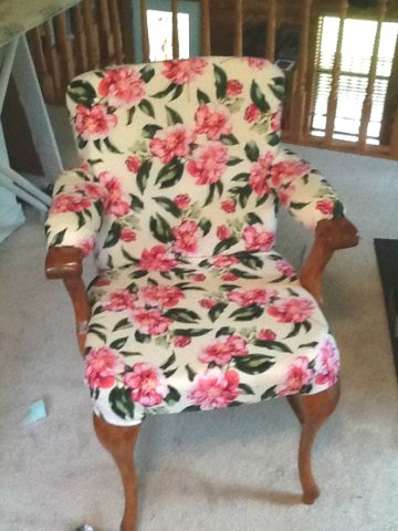Първо много умивах какво точно да направя, имах просто големи количества дунапрен и този стол. Изрязах си макети на седалката и облегалката на обикновено парче стари парцали и след ги наложих на дунапрена и изрязах и него, с остатъците от изрязания дунапрен си направи две еднакви парчета, които използвах за подлакътници. След като закрепих всички парчета от дунапрена, стола изглеждаше покъртително зле  Crossing Arms Нямах идея как да се справя с задната част на облегалката. Тогава за малко преустанових дейност и реших да потърся плат, с които да облека стола. Накрая се възползвах от един стар спален комплект и облякох целия дунапрен, с помощта на такер /който не знам от къде е купен, но го имаше в къщата/. И отново се стигна до проблема с гърба на облегалката... След много чуденки накрая ми просветна - просто изрязах парче дебел картон по формата на облегалката и го облякох със същия плат, след което с малки пирони го заковах към гърба на стола. Не е особено стабилно, но все пак гърба на облегалката няма да се използва кой знае колко. На дъното на седалката също сложих парче картон, но без да го обличам, че така или иначе никой няма да гледа какво има под стола  Grinning