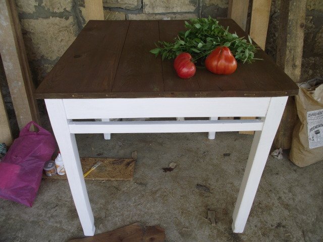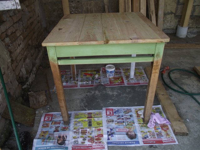 Ето я масата /тя е външна и по-груба/ със шлайфан плот /той беше ужасно зелен, както е отстрани
