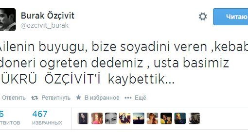 Текст твита: Глава нашей семьи, давший нам свою фамилию, научивший нас готовить, наш наставник - Шюкрю Озчивит покинул нас....