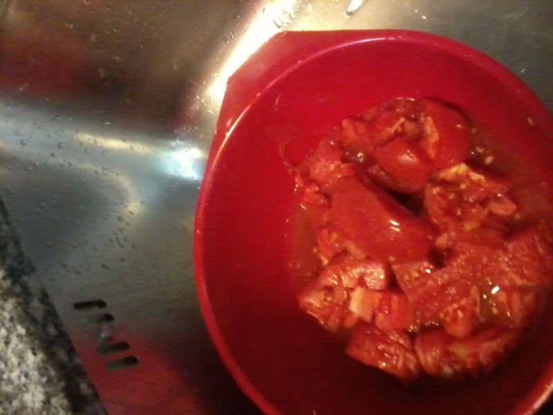 лесно белим кожички, отстраняваме твърда сърцевина  и режем на парчета