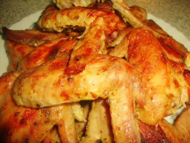 Много вкусни неща са показани преди мен.От мен нещо простичко.Печени крилца, мариновани с едра горчица и сос от мед, лимон и джинджифил и печен патладжан/пак.За гарнитура купешки сладко-кисел сос.