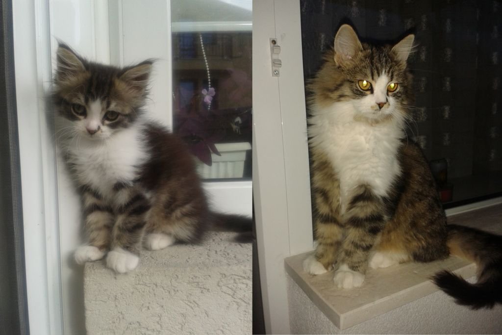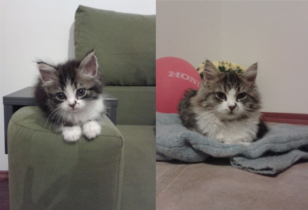 Кас, набор Май 2014г. е, сега е на 5 месеца, 2.5 кг. Прави ми прическа сега, седналал съм на пластмасов стол, щото тече ремонт, косата ми е почти до кръста и Късметка се изправя на две лапи, хваща колкото коса може докопа и хапе... Какво хапе и тя не знае, докато не ме оскубе и я изгоня Simple Smile