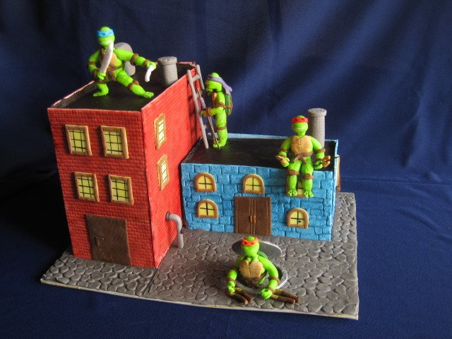 Сега да Ви покажа последната торта, която правих през октомври месец за моят син. Както повечето ми торти и тази ми беше инфарктна торта, даже една от най -инфарктните...Разполагах с време този път, но се захванах с неща, които до сега не бях правила и времето ми се оказа малко в крайна сметка- 6 дни от 10ч. до 22ч. не ставах от стола, накрая вече се бях изгърбила от седене ooooh!. Както се казва опитах да се предизвикам, но тази лъжица се оказа не много подходяща за моята паница...Темата е Костенурките Нинджа- гледах в нета вдъхновения и реших да направя нещо по-различно от тях.Та ,така реших да има четири костенурки в различни пози и сградите да са в реален размер.То бяха еди чертежи, макети в реален размер-едни изчисления паднаха  и накрая установявам  при сглобяването на тортата, че на стените на сградата на две проскости съм обърнала шарката на тухлата,също така се и бяха  поизвили от съхненето.За да ги напасна според щарката тръгнах да ги подрязвам стените, те почнаха да се трошат, а това се развива в нощта преди ЧРД-то...направо щях да се пръсна от притеснение-нямах време за нови, нямаше кога да съхнат. Twisted Evil Замаскирах някак си нещата, викнах неволята...лепих, мазах, натаманявах...грозна работа...