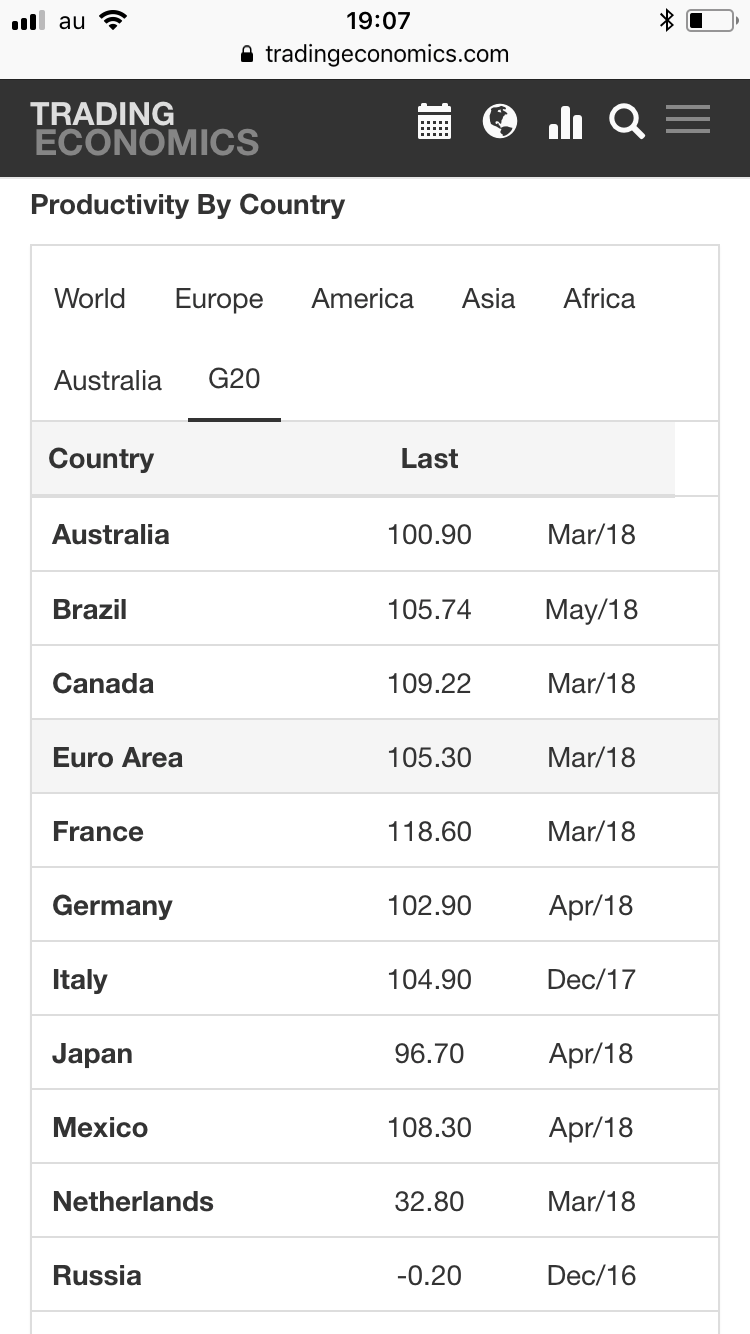 Производителността на труда се измерва като БВП (в даден сектор) се раздели на броя работници, заети в него. Както виждаш от снимките за Г20, Япония е с най-нисък коефициент.