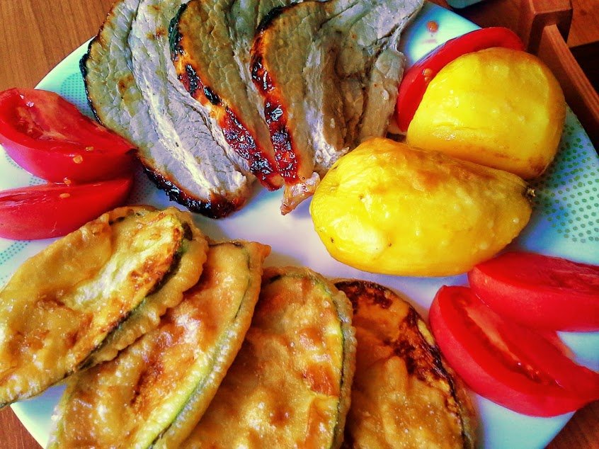 Тиквичките са панирани с кашичка от яйца, брашно, мъничко водичка и мъничко сол.